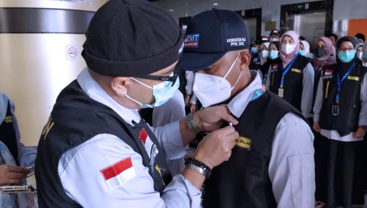 TIMES Nias/Kapuskes Haji Kemenkes Budi Sylvana saat menyematkan pin kepada petugas kesehatan haji. (FOTO: dok. Kemenkes)