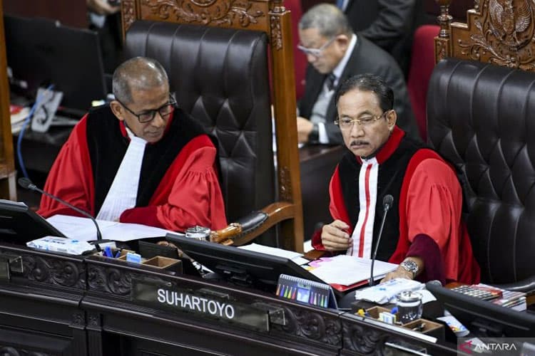 TIMES Nias/Ketua Mahkamah Konstitusi (MK) Suhartoyo (kanan) bersama Wakil Ketua MK Saldi Isra memimpin sidang pengucapan putusan perkara dilanjutkan atau tidak (dismissal) sengketa Pilkada 2024 di Gedung Mahkamah Konstitusi, Jakarta, Rabu (5/2/2025). (ANTARA)