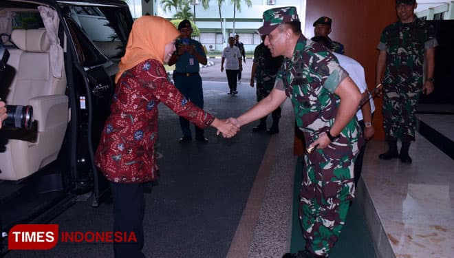 TIMES Nias/Pangdam V/Brawijaya, Mayjen TNI Wisnoe, P.B, menyambut kedatangan Gubernur Jatim, Khofifah Indar Parawansa di Makodam V/Brawijaya, Rabu (20/2/2019).(Foto: Istimewa)